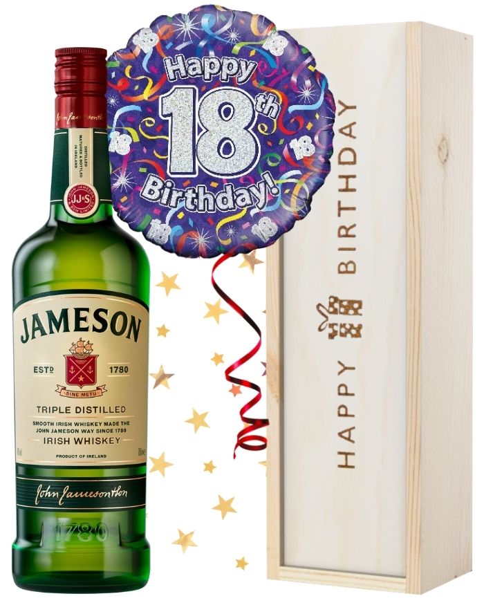 Whether for a family member or friend, help make their 18th birthday memorable by sending this delightful Whisky gift. Perfect for enjoying over time, gift someone a single bottle of Jameson Irish Whiskey and let them enjoy their first legal drink! It’s presented in one of our wooden gift boxes with ‘Happy Birthday’ printed on the lid. Plus, it also includes a fully-inflated 18th birthday balloon that’ll float out upon opening. It’s the perfect birthday surprise for any 18 year old. Have it delivered anywhere in the UK with next day or selected date delivery, and don’t forget to include a personalised message!