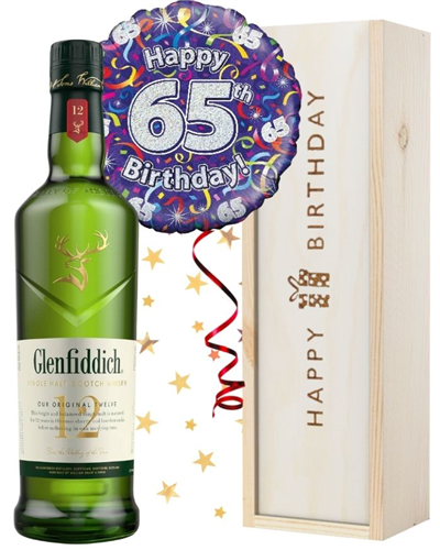 Make someone’s 65th the best birthday yet by sending them this Whisky and balloon gift set. Treat someone to a single bottle of delicious Glenfiddich Whisky to enjoy on their special day. It’s beautifully presented in one of our wooden gift boxes with ‘Happy Birthday’ printed on the lid and wood wool lining for protection. Plus, it also includes a fully-inflated 65th birthday balloon that’ll float out upon opening. It’s the perfect birthday surprise for anyone who loves Whisky! Personalise this gift with a printed gift message and have it delivered anywhere in the UK. Next day or selected date delivery is available.