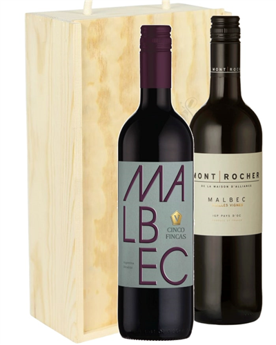 Presented in a gorgeous wooden gift box designed for secure delivery to any location, this extraordinarily delicious Malbec Mixed Two Bottle Wine Gift Box allows the recipient to enjoy more than one variety of different Malbec wine flavours. Ideal as a gift for someone with a true appreciation of bold Malbec grapes, this incredible box boasts two types of truly rich wine within it; one from the foothills of the Andes in Argentina, and one from the vineyards of France. Easily personlised so you can assure the recipient knows who to thank, this one of a kind unit is certain to be savored by anyone lucky enough to receive it.