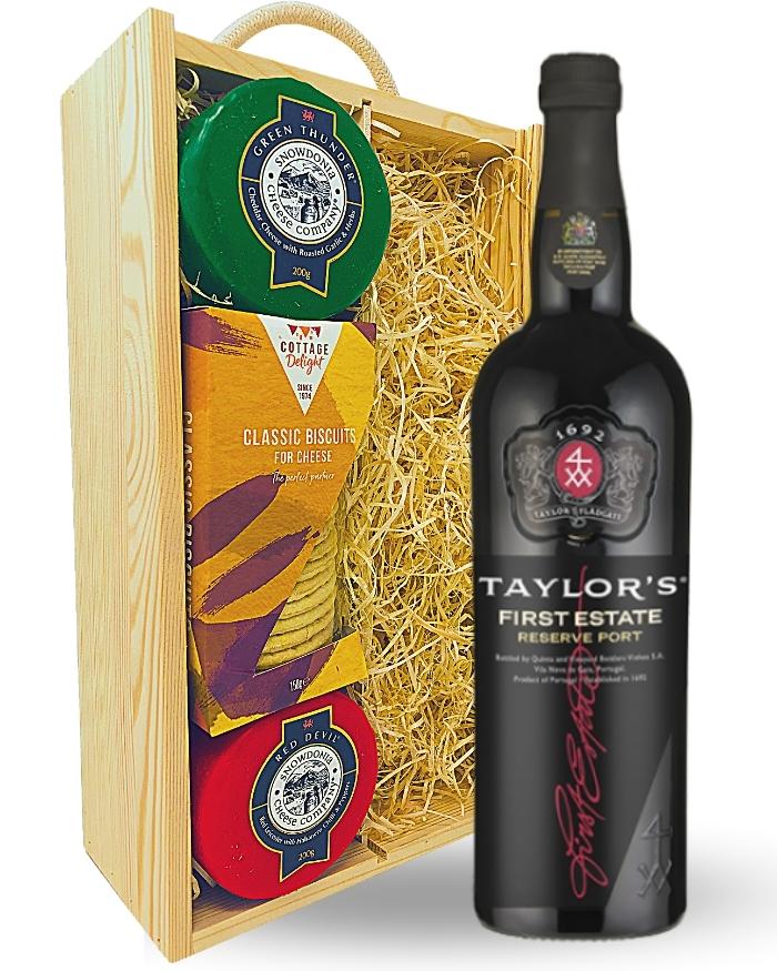 Whether for a family gathering or a romantic night in, no evening is complete without this exceptional gift hamper. Surprise any friend, family member or colleague with a single bottle of Taylors First Estate Reserve Port along with a box of Cottage Delight Biscuits, Snowdonia Green Thunder Cheese and Snowdonia Red Devil Cheese. Green Thunder is a Cheddar Cheese with roasted garlic and herbs. Red Devil is a Red Leicester with Habanero chillies and peppers. It’s all presented in one of our wooden gift boxes and is protected with wood wool to ensure safe delivery. Personalise this gift with a written message and have it delivered anywhere in the UK with next day or selected date delivery.