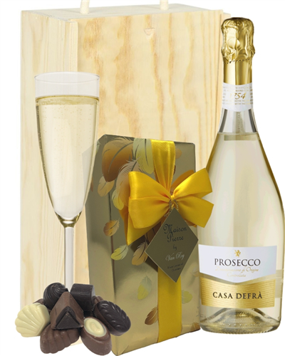 Now, this is the perfect gift for any Prosecco or chocolate lover, no matter the occasion! Surprise someone you know to a single bottle of Casa Defra Prosecco along with a box of assorted Belgian chocolates to enjoy. Deliciously paired, this gift is all packaged and presented in one of our classic wooden gift boxes and is protected with wood wool to ensure safe delivery. You can send this gift anywhere in the UK, either the next day or on a selected date, making it the perfect gift to send! Plus, don’t forget to add a personalised message, so your recipient knows who to thank for such a wonderful gift.